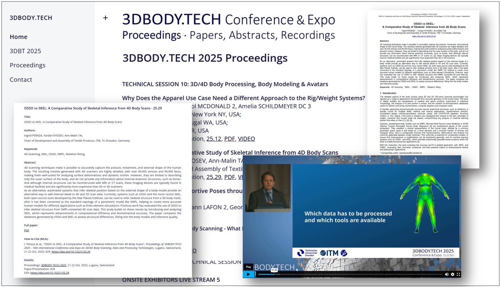 The website proc.3dbody.tech is dedicated to the proceedings of the series of 3DBODY.TECH Conferences & Expos. The abstracts, papers and presentation videos (when available) of over 900 publications/presentations included in the proceedings of all conferences and workshops are accessible at the website. The full papers are freely available for download as single PDF documents. The recordings/videos of the single presentations and live demonstrations are freely accessible (when available). Also available at the website is a dedicated search tool.
